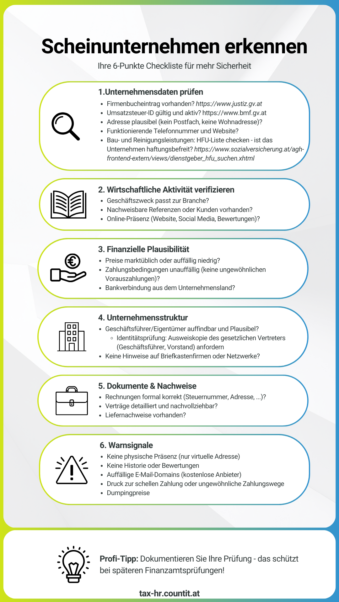 Führen Sie bei neuen Geschäftspartner*innen eine kurze Plausibilitätsprüfung durch. Dokumentieren Sie Ihre Schritte – das kann im Fall einer Prüfung durch das Finanzamt entscheidend sein. Und: Holen Sie sich bei Unsicherheiten rechtzeitig steuerliche Beratung!